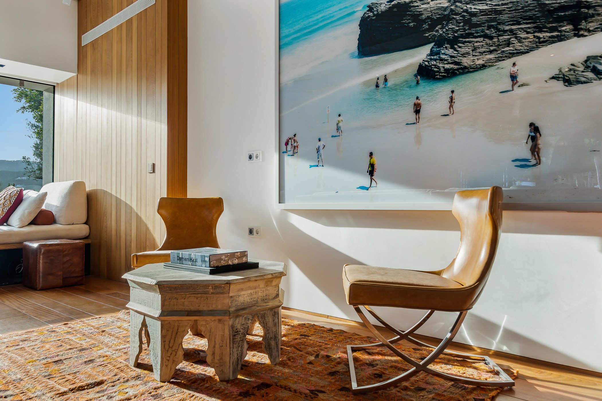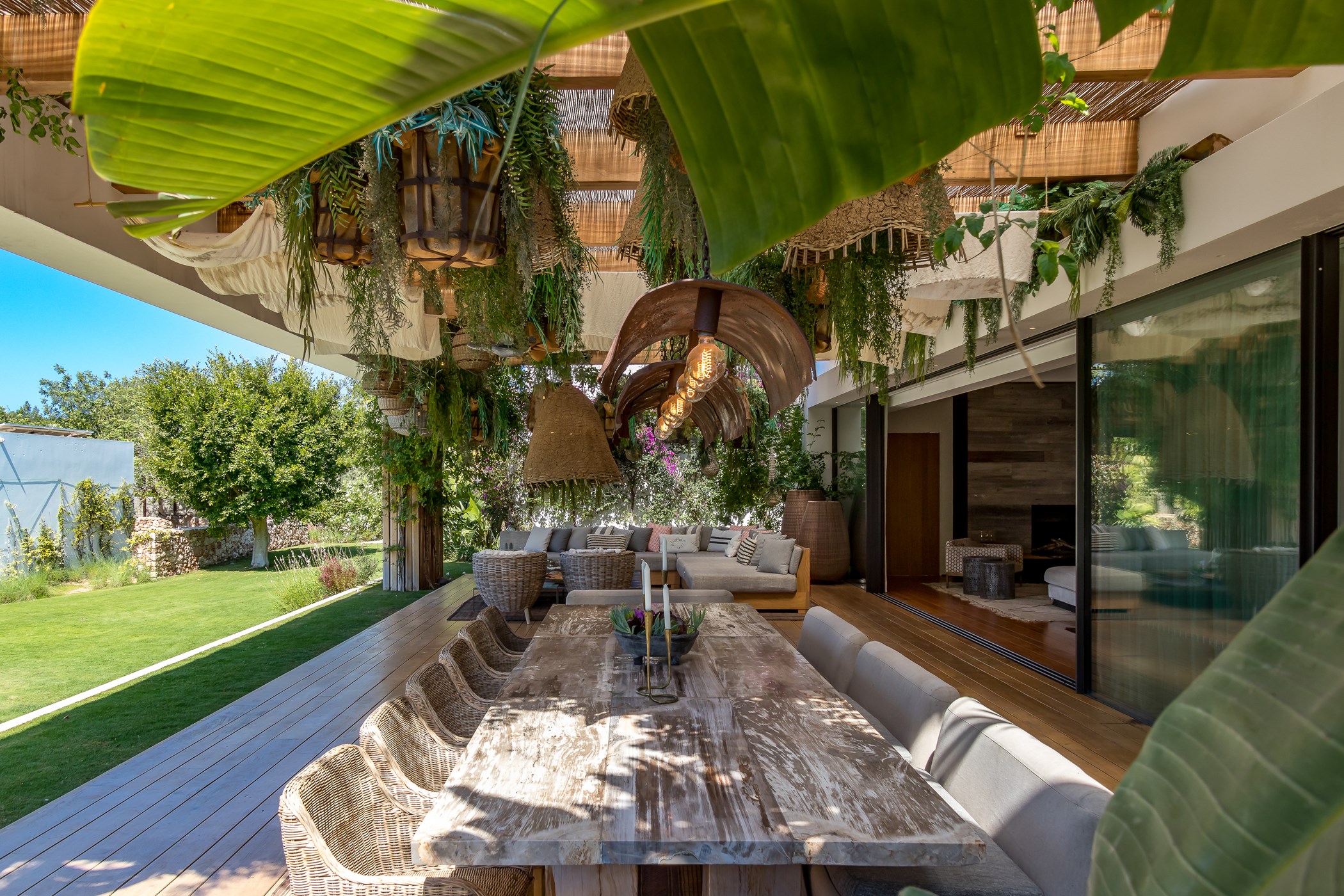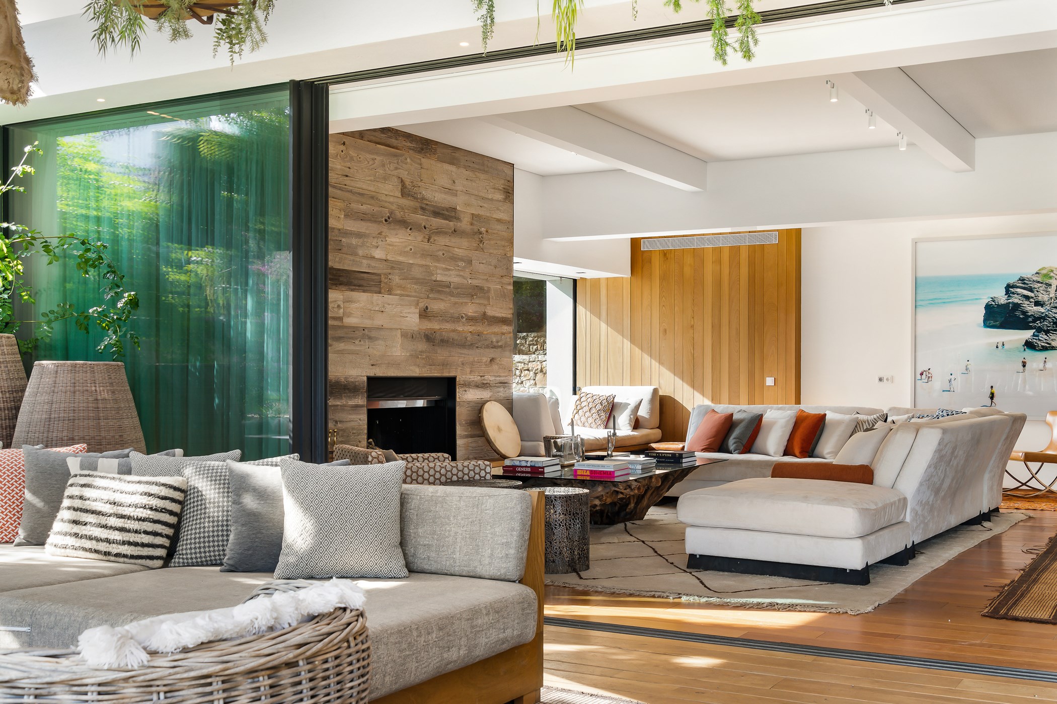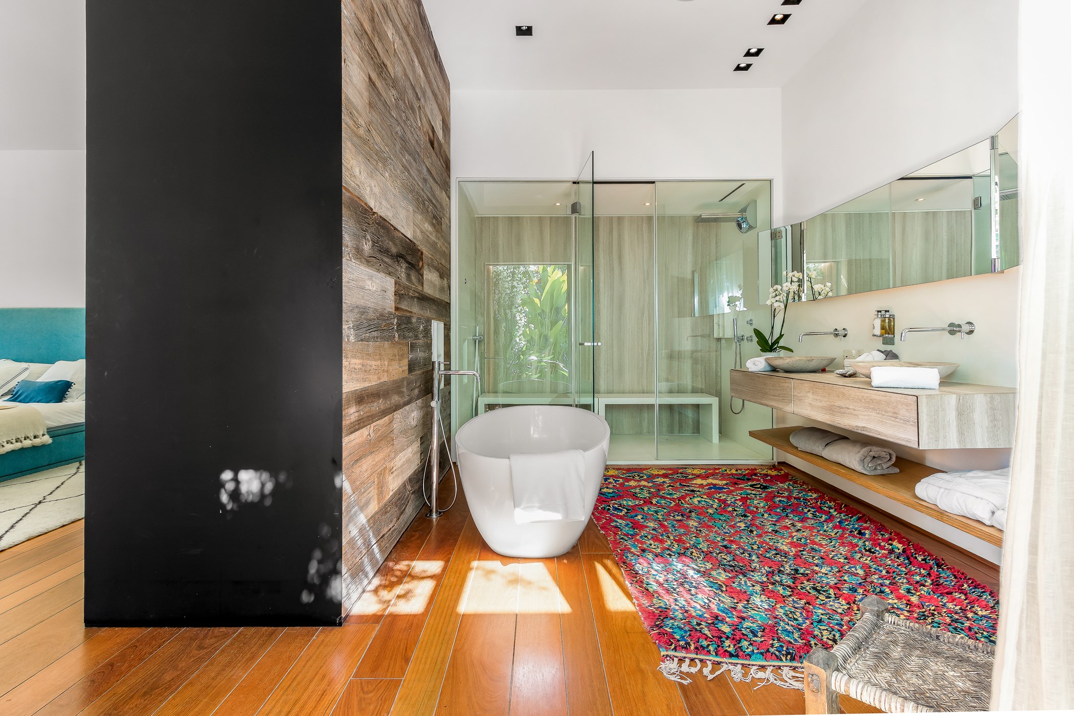 Inside, contemporary design meets natural warmth. Polished wood floors and sleek, modern furnishings create an inviting atmosphere, flooded with natural light. Each of the five en-suite bedrooms is uniquely styled with high-end finishes and organic materials. The master suite is a true sanctuary, featuring a shower, bathtub, hammam, and direct access to a private Jacuzzi and chill-out zone.