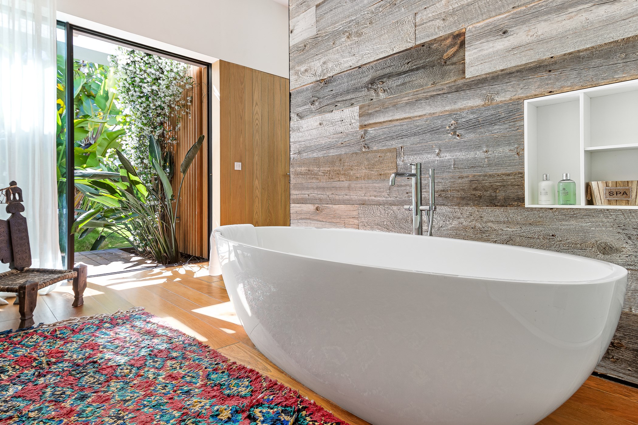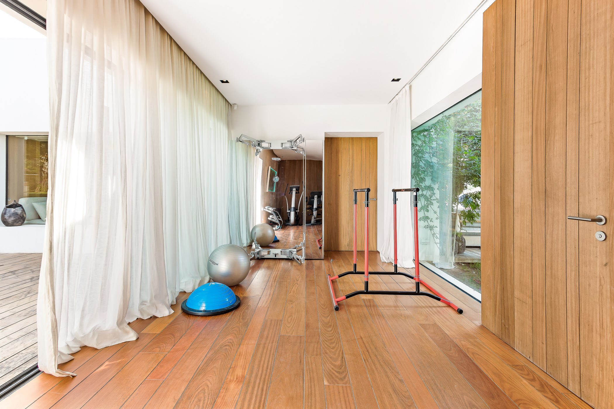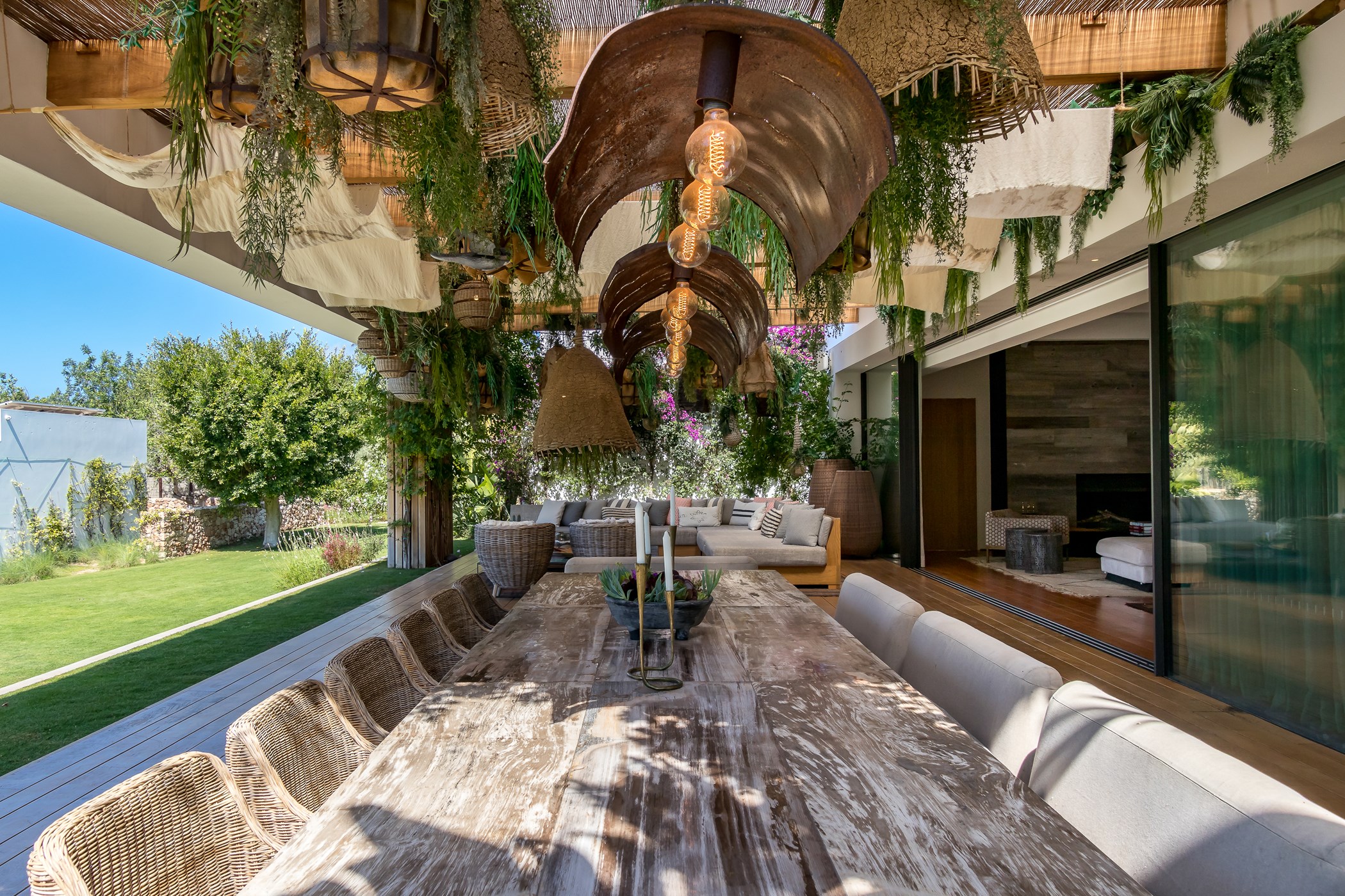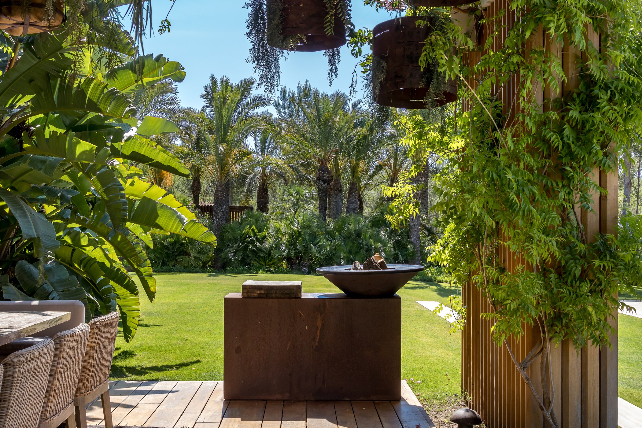 Inside, contemporary design meets natural warmth. Polished wood floors and sleek, modern furnishings create an inviting atmosphere, flooded with natural light. Each of the five en-suite bedrooms is uniquely styled with high-end finishes and organic materials. The master suite is a true sanctuary, featuring a shower, bathtub, hammam, and direct access to a private Jacuzzi and chill-out zone.