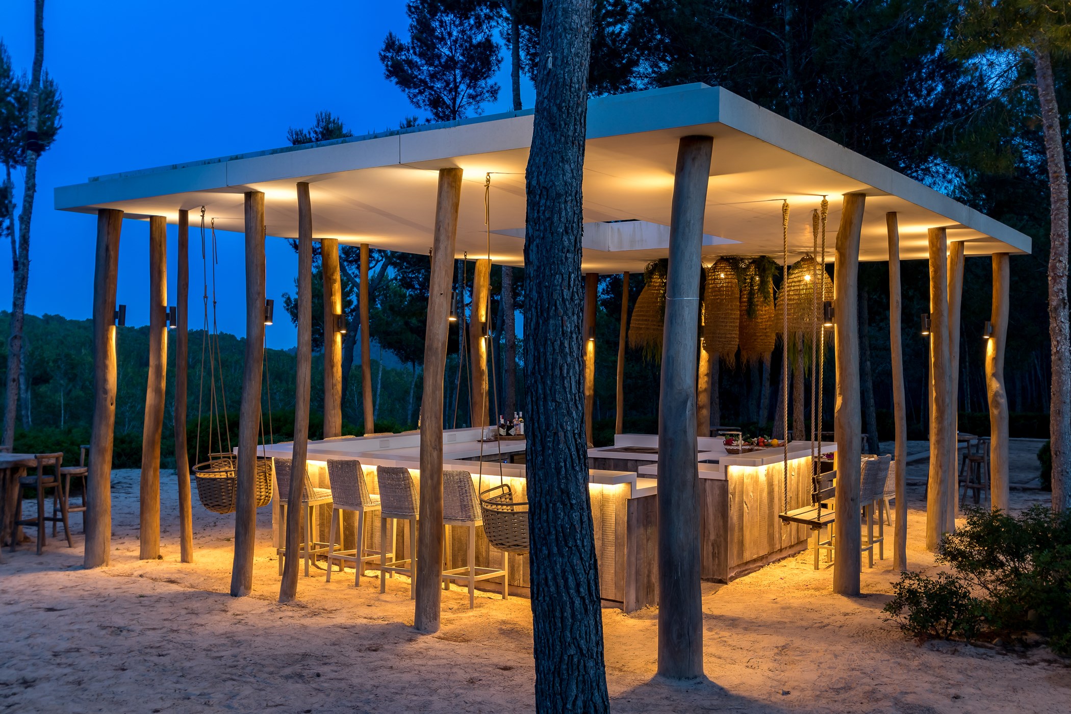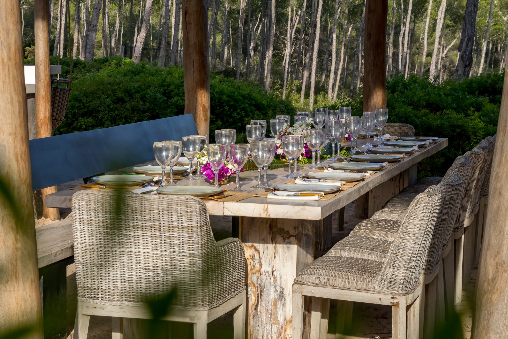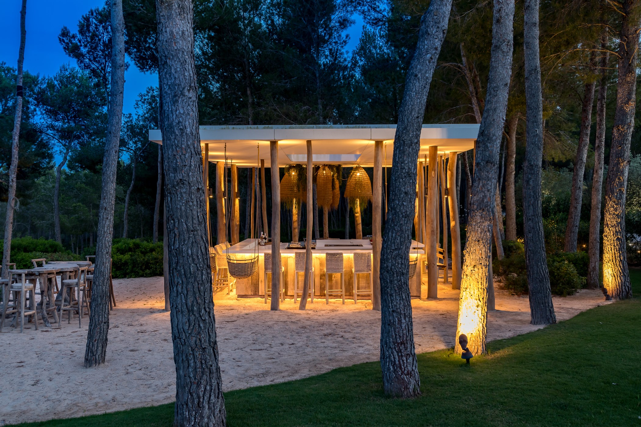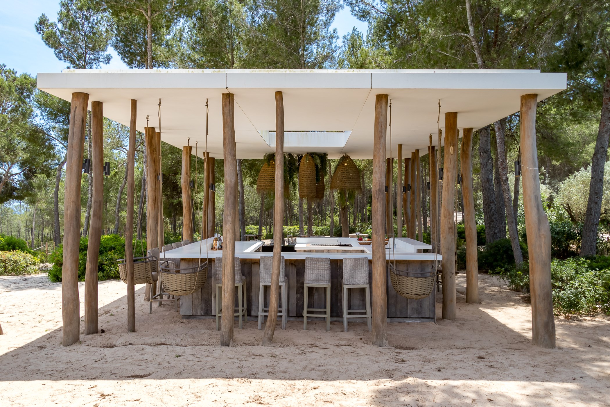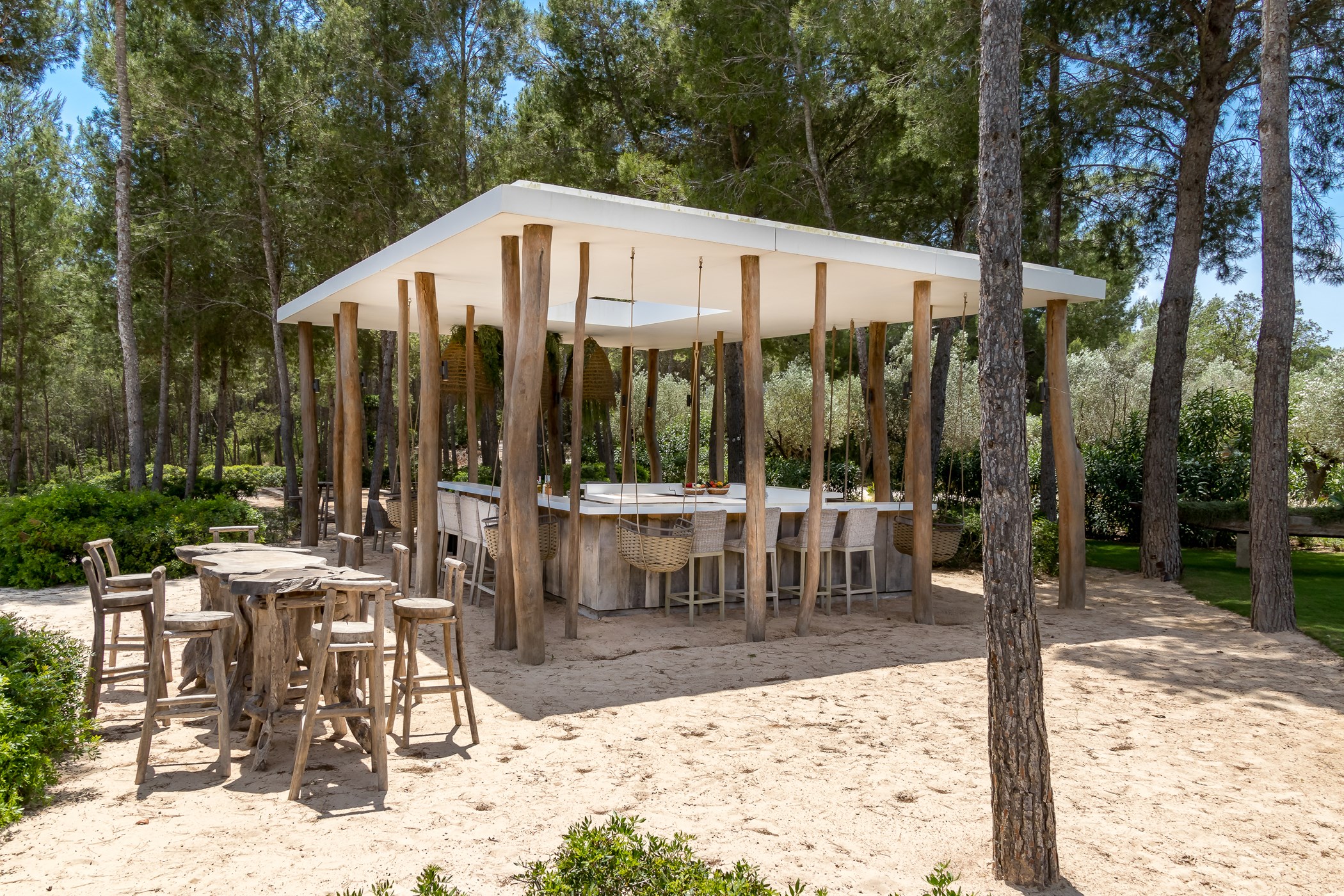 The expansive terrace is designed for relaxed luxury, with a deep-cushioned corner lounge, an extended dining area, and a second shaded al-fresco space set across soft white sand. Nestled beneath tall pines, a professional bar with seating for up to 30 guests invites you to savor panoramic sea views in total comfort.