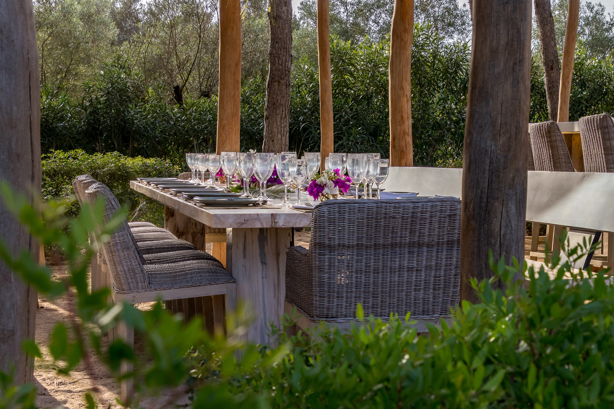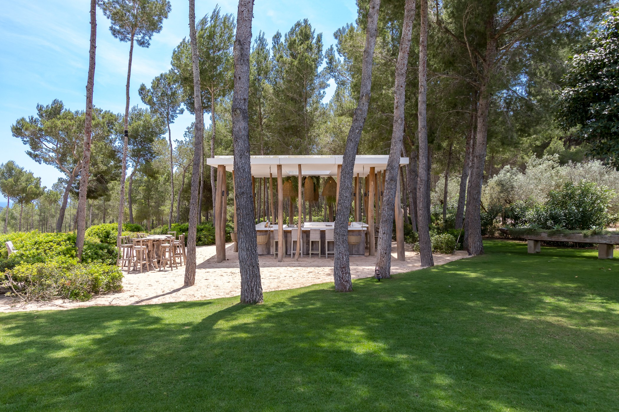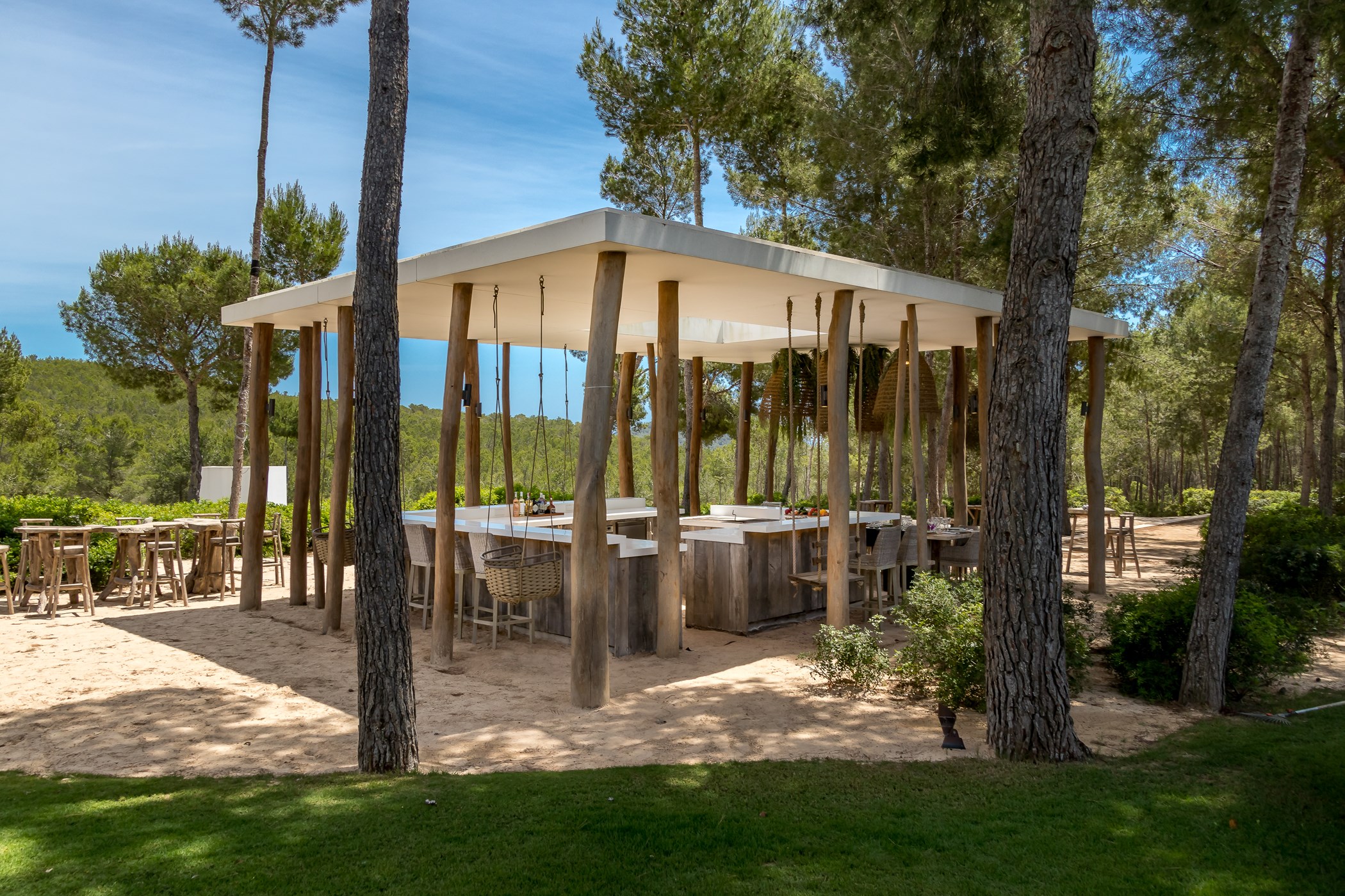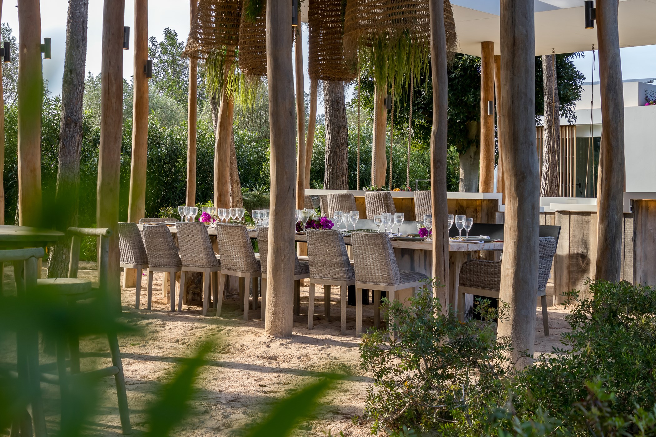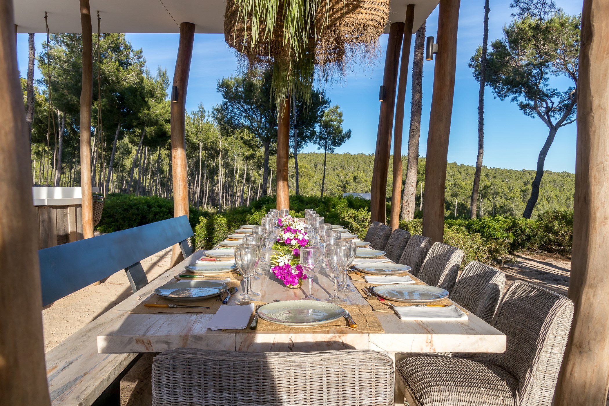 The expansive terrace is designed for relaxed luxury, with a deep-cushioned corner lounge, an extended dining area, and a second shaded al-fresco space set across soft white sand. Nestled beneath tall pines, a professional bar with seating for up to 30 guests invites you to savor panoramic sea views in total comfort.