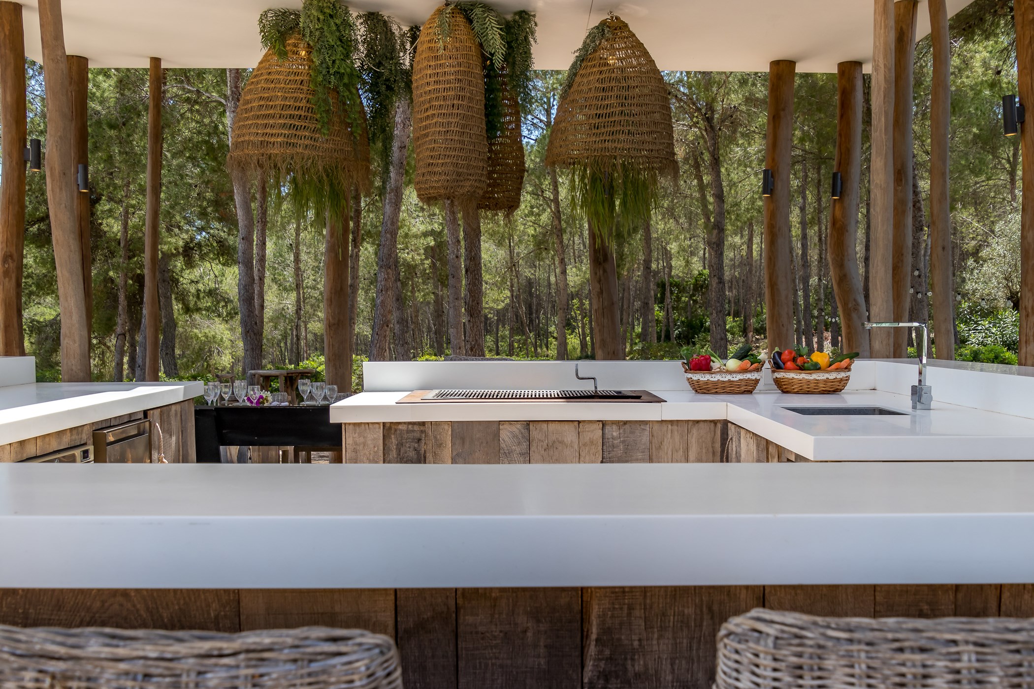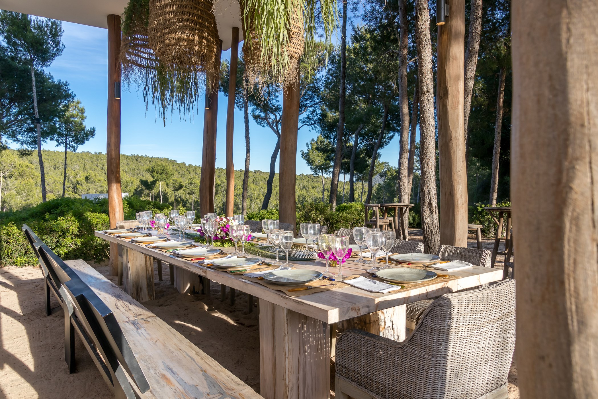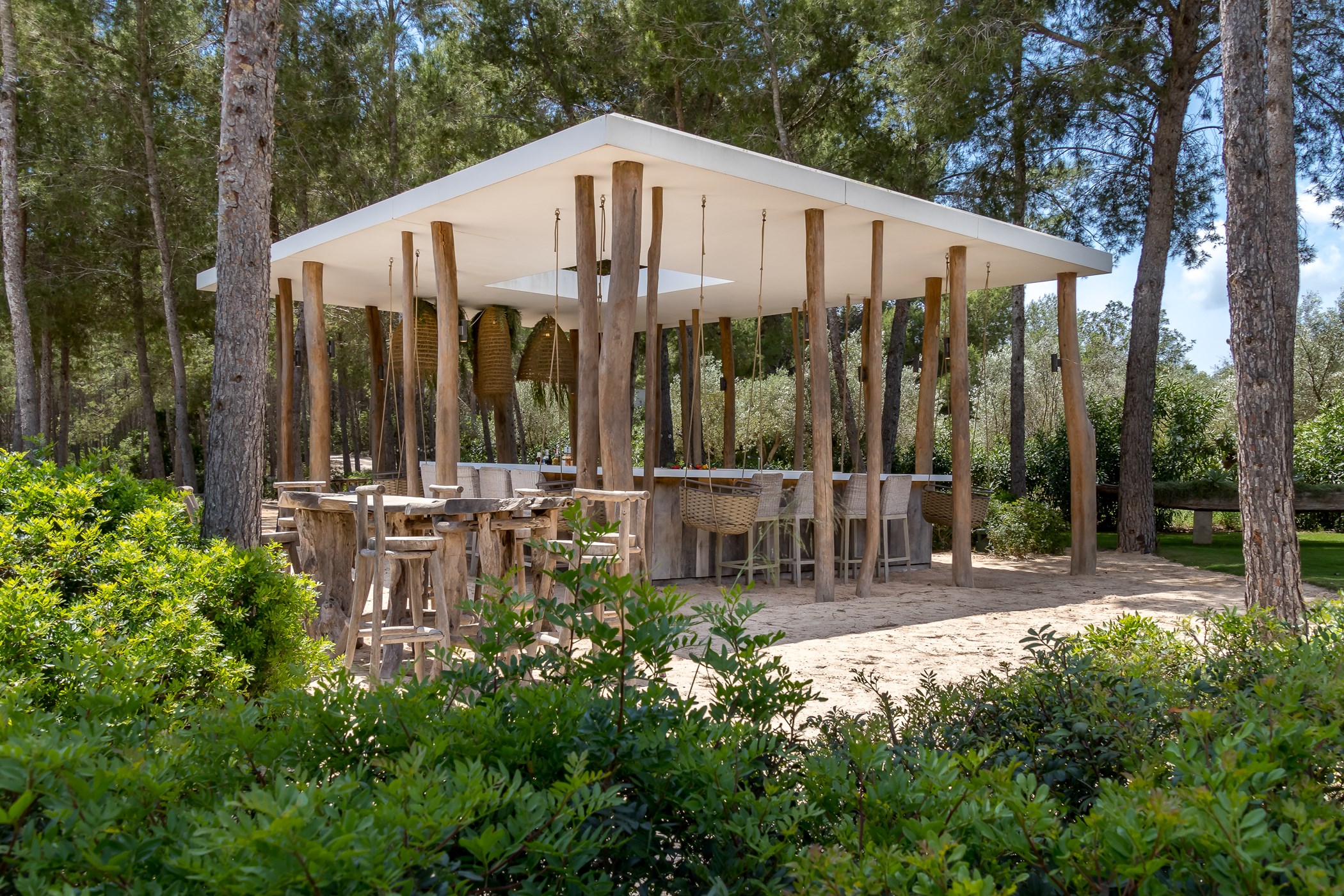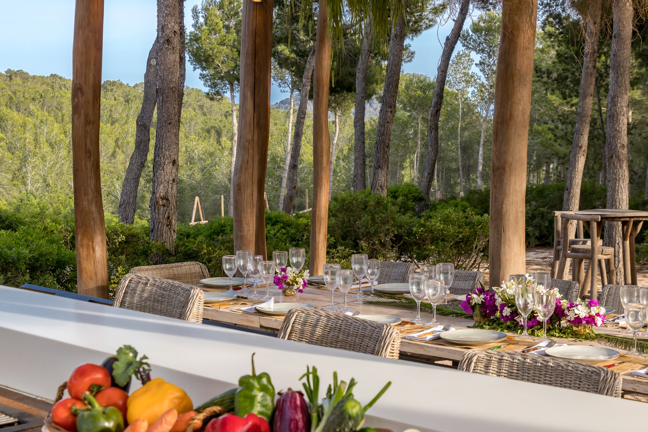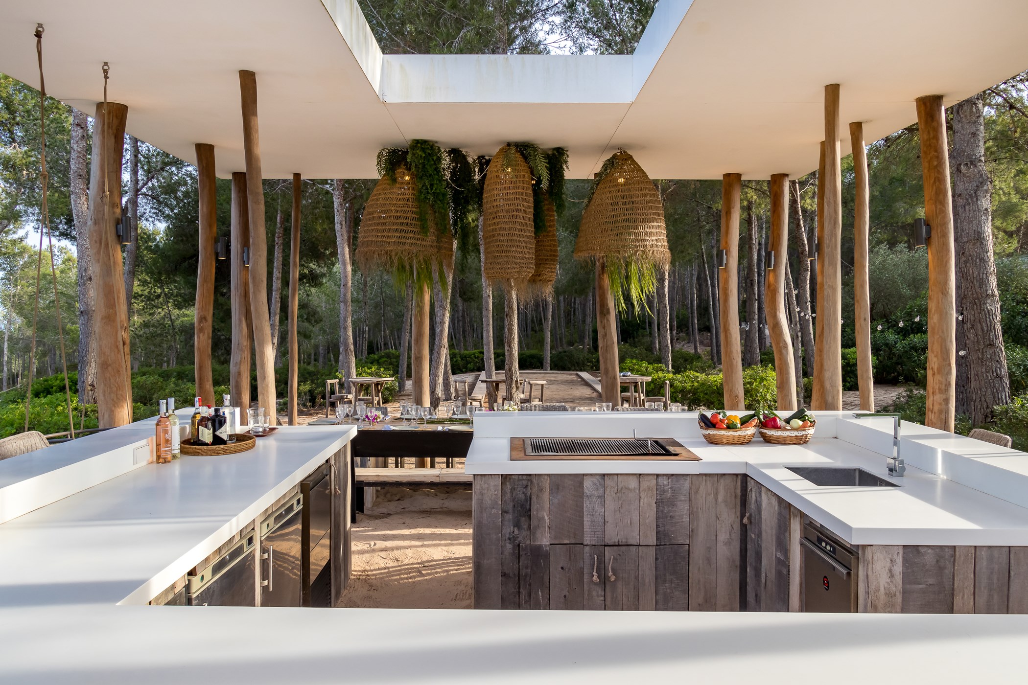 The expansive terrace is designed for relaxed luxury, with a deep-cushioned corner lounge, an extended dining area, and a second shaded al-fresco space set across soft white sand. Nestled beneath tall pines, a professional bar with seating for up to 30 guests invites you to savor panoramic sea views in total comfort.