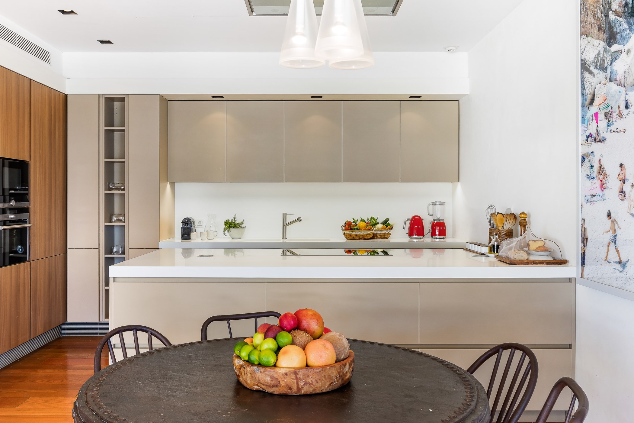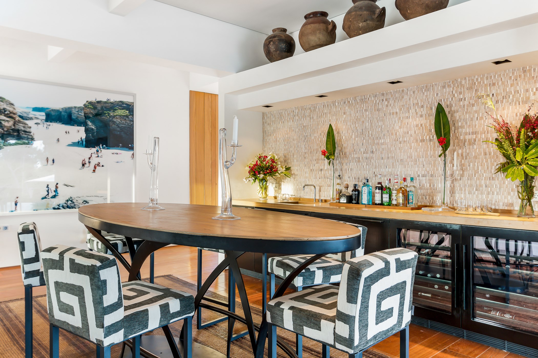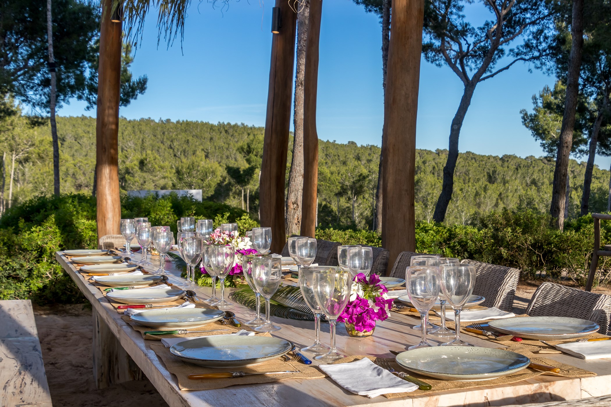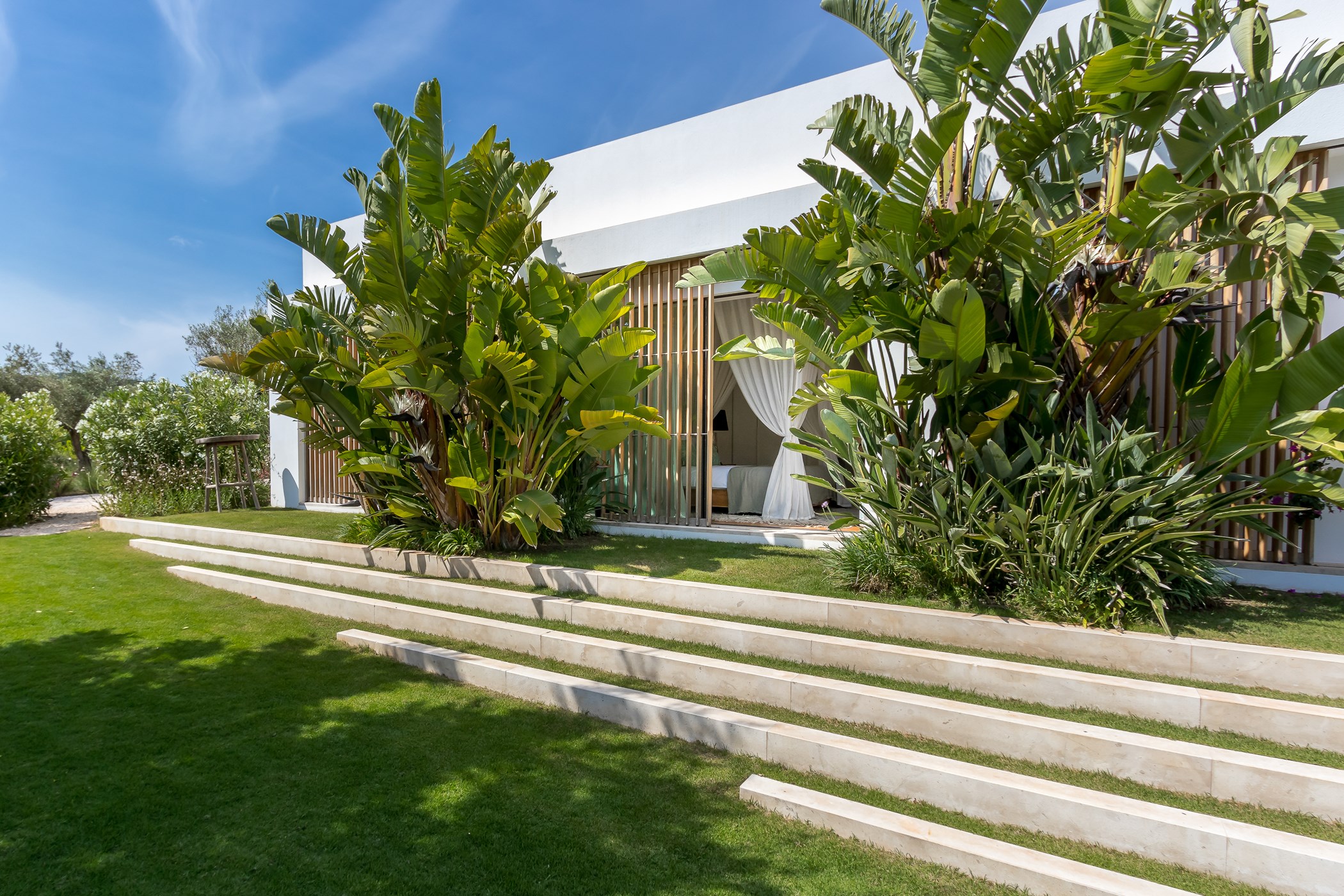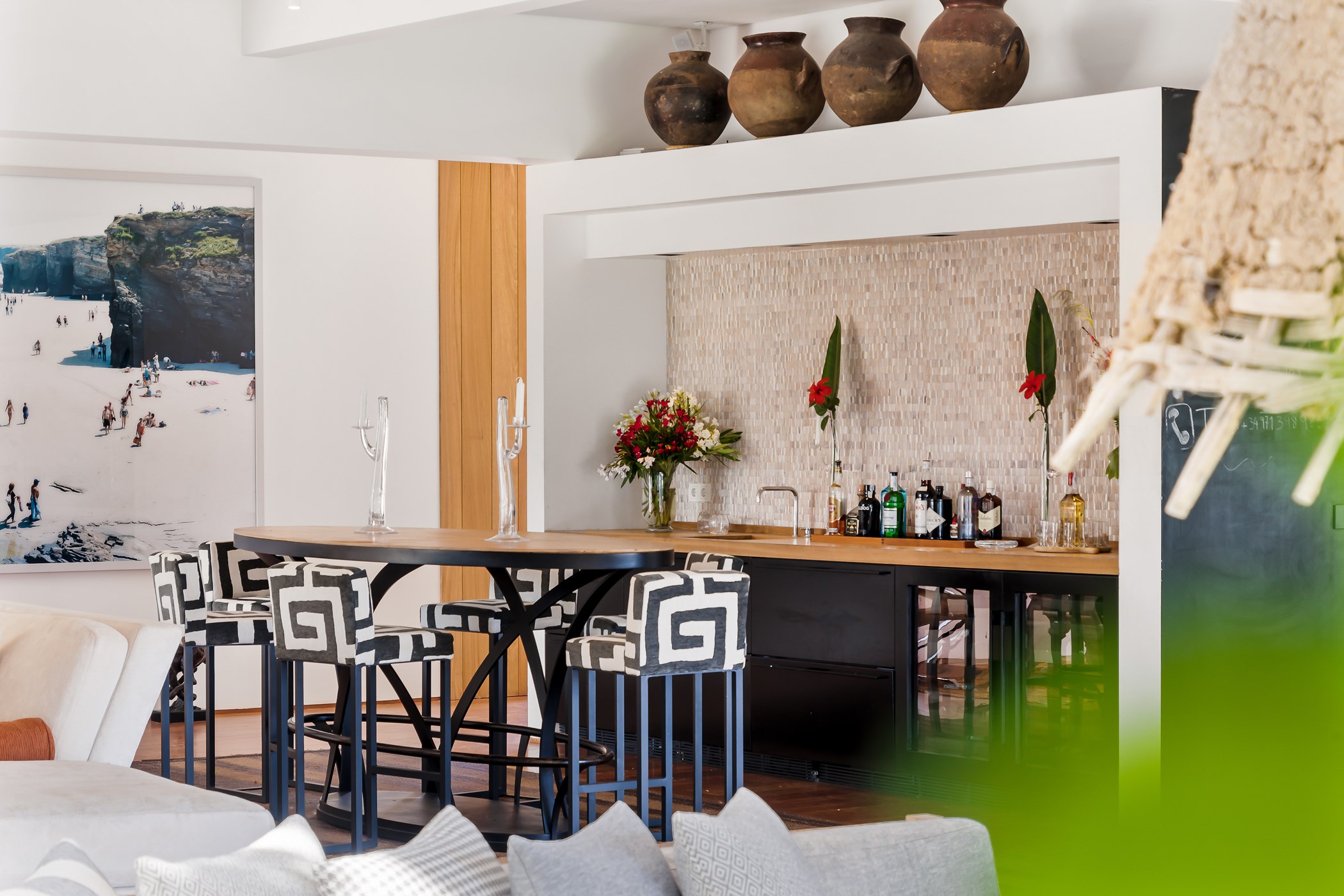 The expansive terrace is designed for relaxed luxury, with a deep-cushioned corner lounge, an extended dining area, and a second shaded al-fresco space set across soft white sand. Nestled beneath tall pines, a professional bar with seating for up to 30 guests invites you to savor panoramic sea views in total comfort.