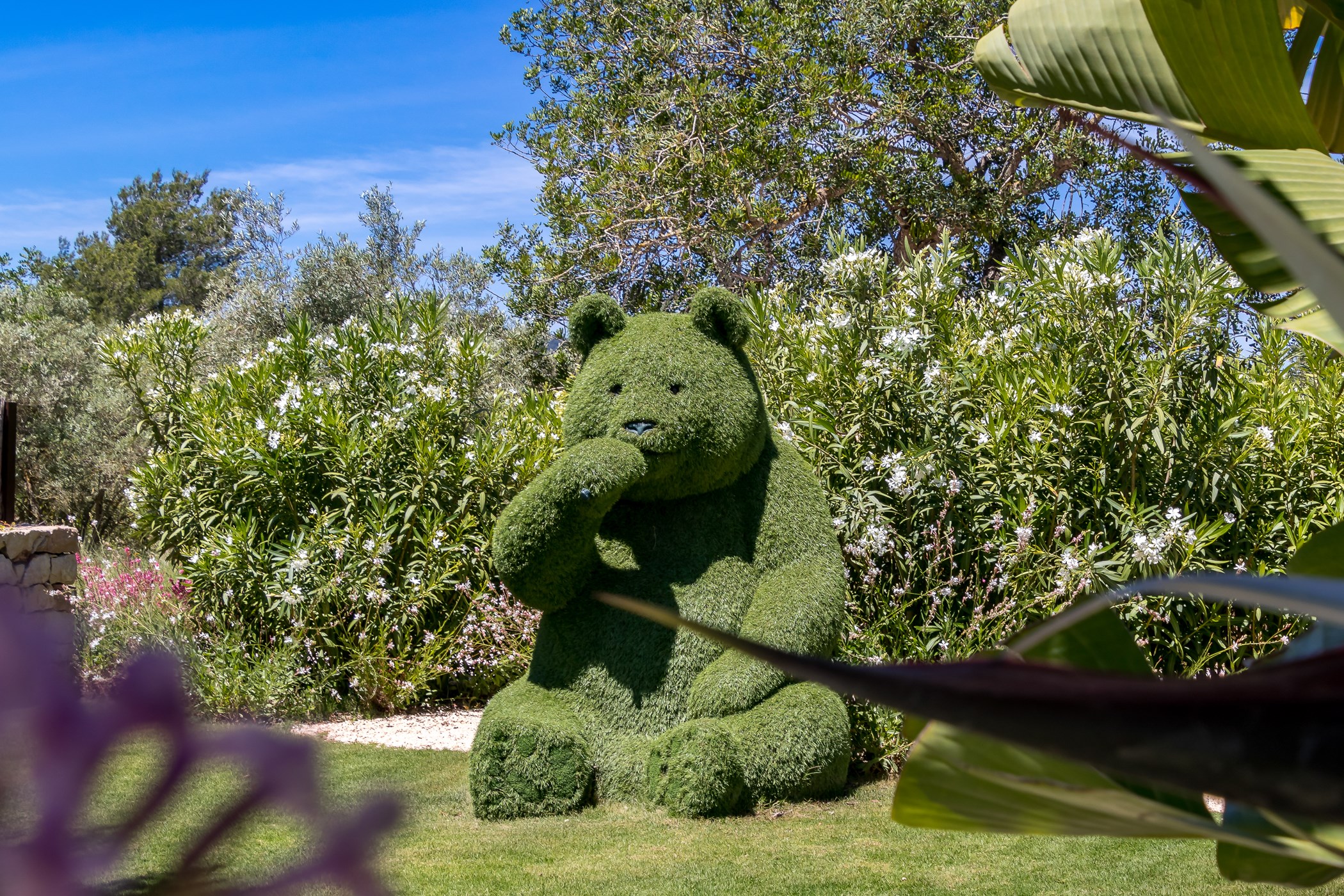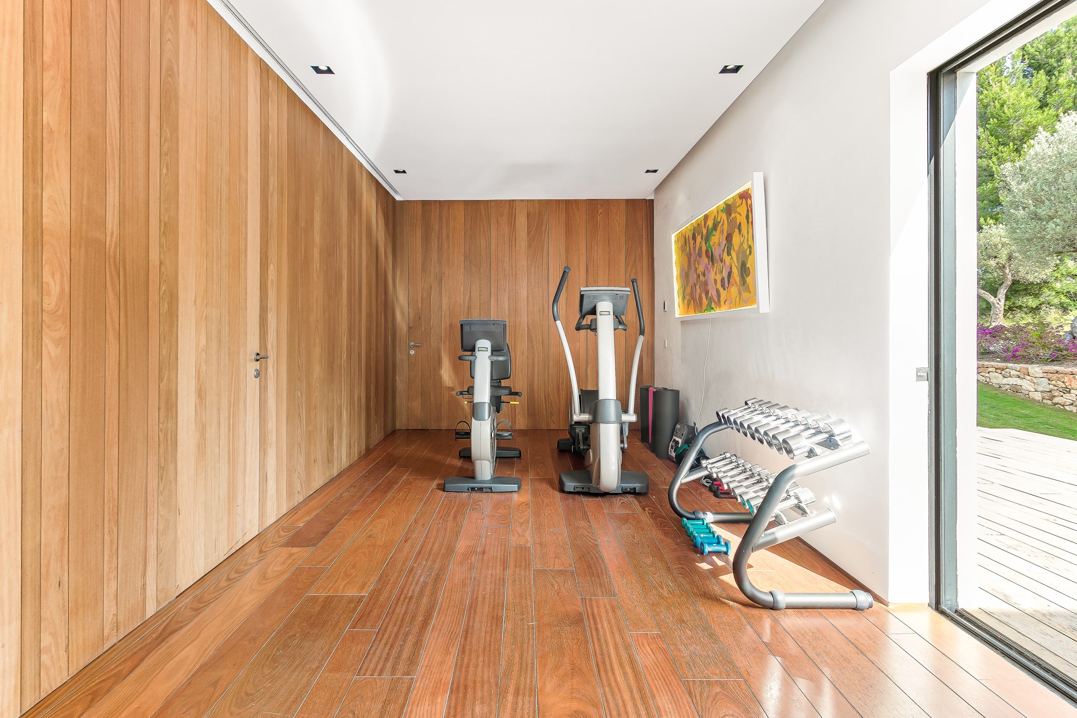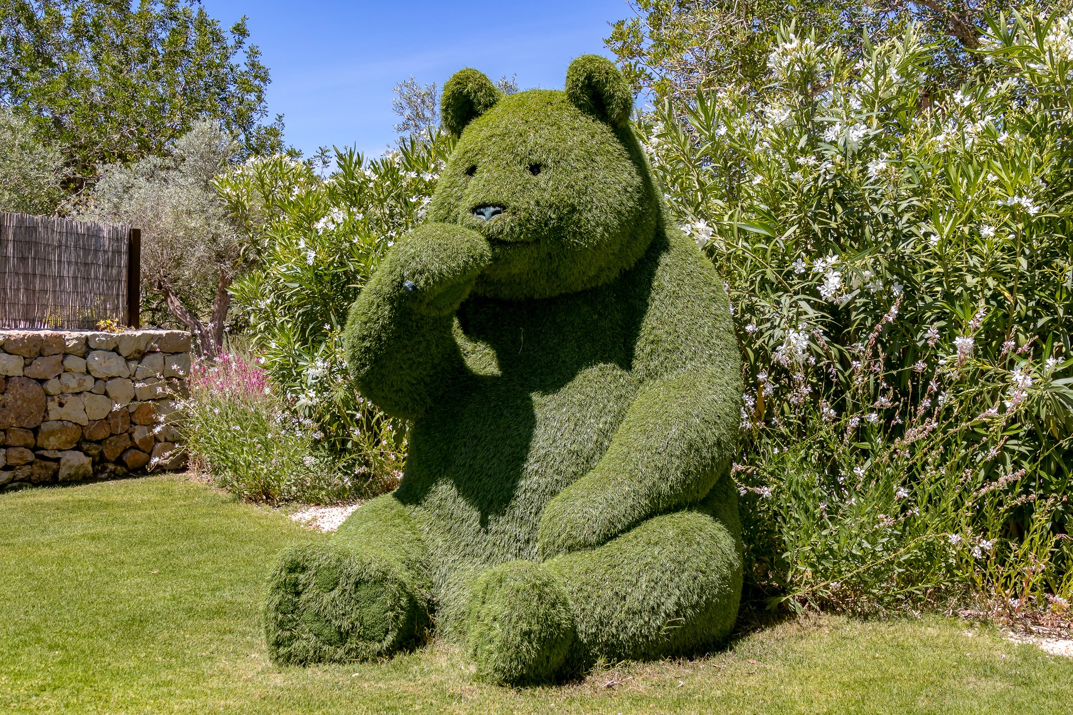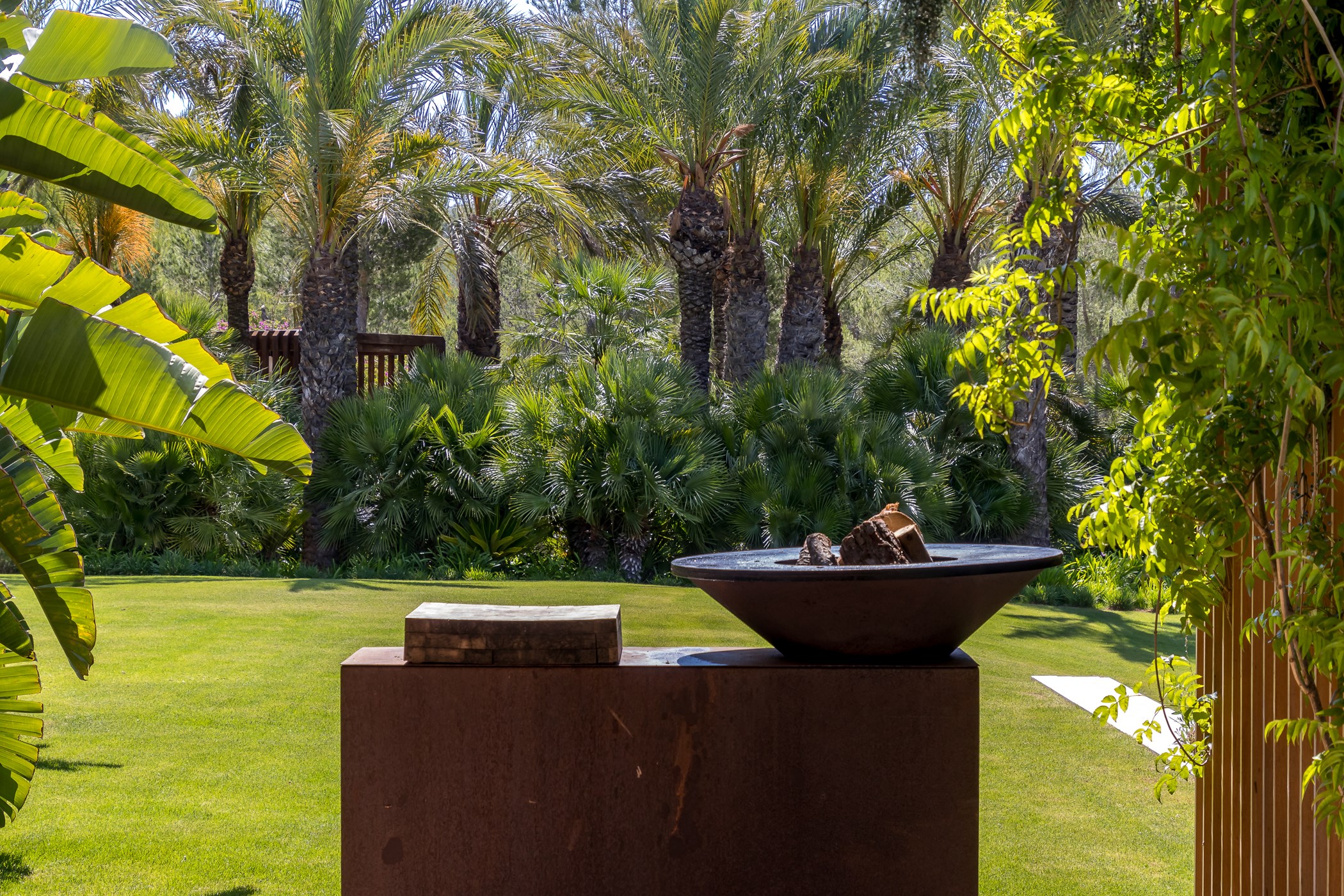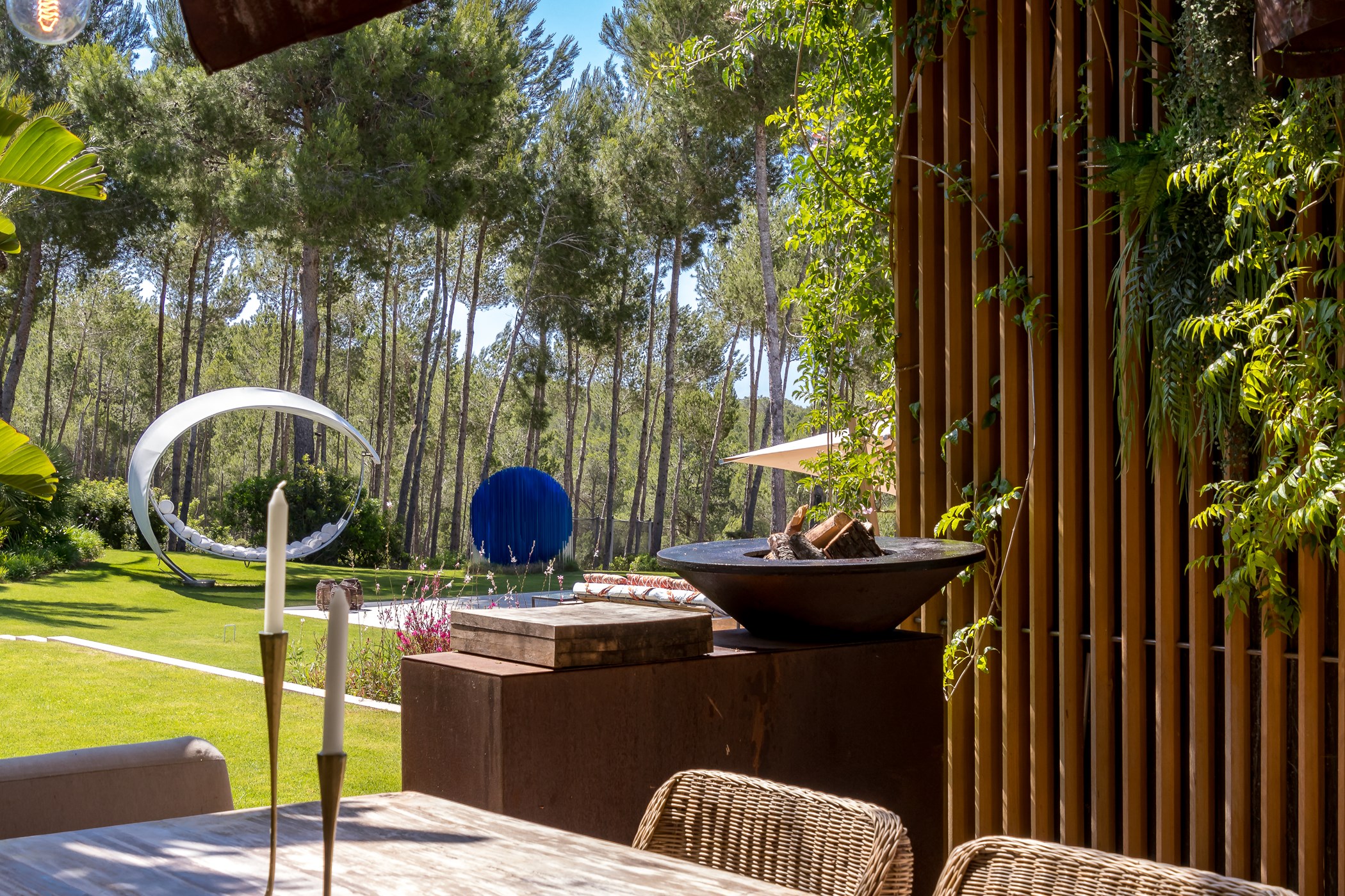 Set amidst swaying palms and fragrant pines, the villa’s landscaped grounds are equally impressive. At the heart is a striking infinity pool, surrounded by sculpted lawns and curated art installations. Highlights include a large Jacuzzi, pétanque court, and a custom-designed outdoor cinema.
